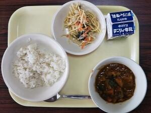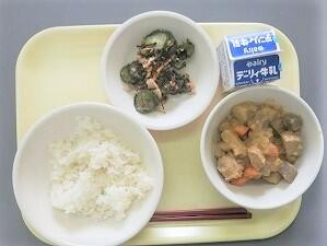 白ごはん(日南産早期米)、里いものすり流し汁、魚のカレー揚げ、きゅうり、牛乳
