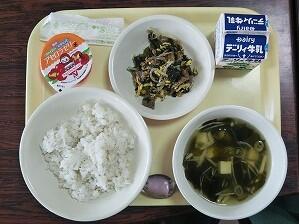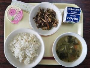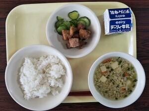 麦ごはん、具だくさんみそ汁、魚の竜田揚げ、青梅ゼリー、牛乳