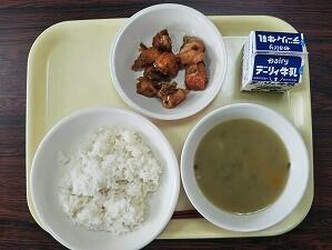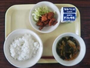 麦ごはん、中華コーンスープ、鶏のからあげ、キャベツ、牛乳