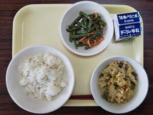 大根葉ごはん、雑穀入りミネストローネ、ほうれんそうオムレツ、ブロッコリー、牛乳