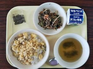 まる麦ごはん、鶏飯の具、鶏飯のスープ、きざみのり、ひじきとごぼうのサラダ、牛乳