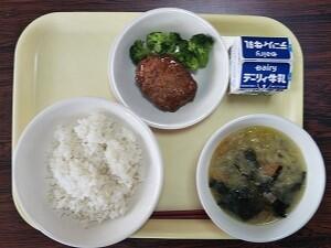 麦ごはん、野菜スープ、照焼ハンバーグ、ブロッコリー、牛乳