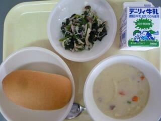 グルメレポート:チャウダーがあまじょっぱくておいしかったです。パンに付けて食べました。(2年3組児童 R)