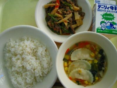 グルメレポート:五目豆腐スープは、たけのこがシャキシャキしていました。牛肉のピリ辛炒めは、お肉とれんこんが合っていておいしかったです。(2年3組児童 K)