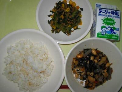 グルメレポート:五目豆は、いろんな具が入っていておいしかったです。おかか和えは、キャベツがさくさくしていておいしかったです。(2年3組児童 S)