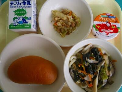スパゲティナポリタンも、給食で人気のあるメニューです。おかわりがあることを祈る児童の様子がみられました。また、フルーツポンチも争奪戦になっているクラスがあったようです。