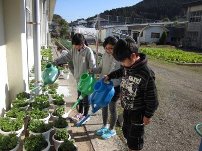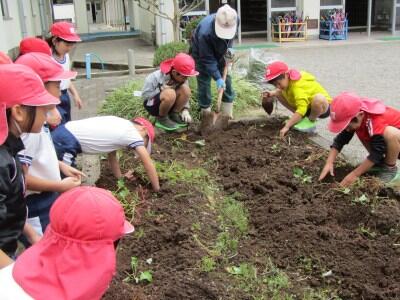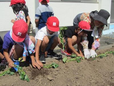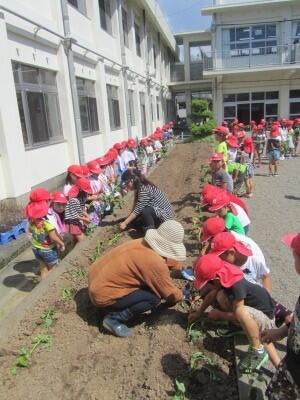 みんなで畝を作り、キャベツとブロッコリーの苗を植え、その隣にホウレンソウと小松菜の種をまきました。大きく育つように、またみんなで世話をしたり観察したりしていくことにしました。
