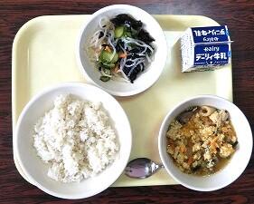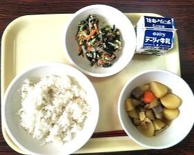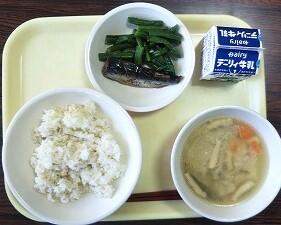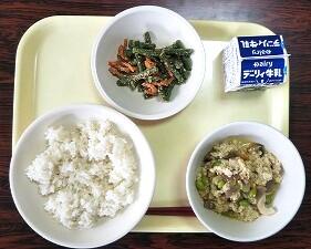 麦ごはん、高野豆腐のそぼろ煮、小松菜の辛子マヨネーズ和え、牛乳