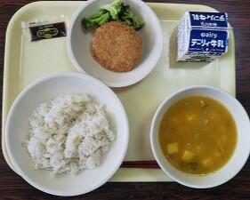 麦ごはん、かぼちゃのみそ汁、彩り野菜とキャベツのメンチカツ、ブロッコリー、減塩中濃ソース、牛乳