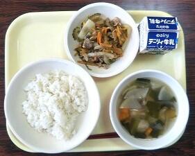 麦ごはん、粉豆腐の炒り煮、いんげんのこま和え、牛乳