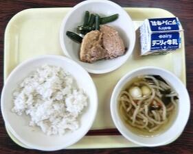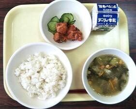 麦ごはん、中華コーンスープ、かつおのオーロラ煮、きゅうり、牛乳