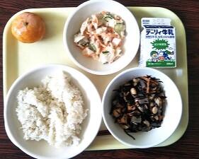 麦ごはん、大豆の磯煮、大根サラダ、冷凍みかん、牛乳