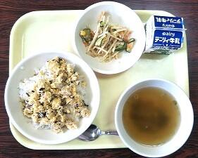 鶏飯(まる麦ごはん、鶏飯の具とスープ、ごぼうサラダ、牛乳)