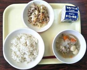 麦ごはん、じゃがいものすいとん、豚肉のオイスターソース炒め、カルフィッシュ、牛乳