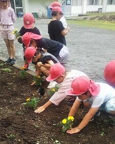 3年生が花壇に花の苗を植えていました。マリーゴールドとホウセンカです。根を切らないようにポットから上手に出して植えていました。きれいな花が咲くといいです。