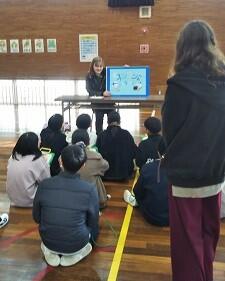 交流①では、1~4年生が体育館に集まって、留学生がそれぞれの自己紹介とお国紹介をしてくださいました。