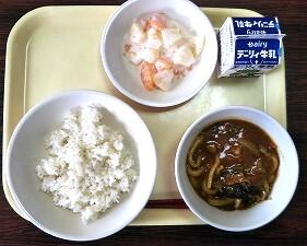 減量麦ごはん、カレーうどん、フルーツヨーグルト、牛乳