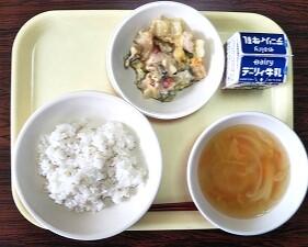 麦ごはん、鶏肉と里いものみそ煮、千切り大根の酢の物、牛乳