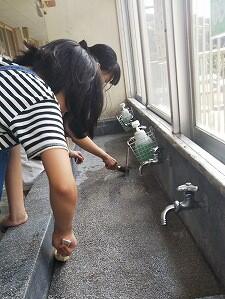 【 ↑ 保健体育委員会:手洗い用の石けん液を補充していました。】