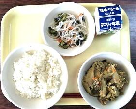 麦ごはん、牛肉とごぼうの卵とじ、きゅうりとわかめの酢の物、牛乳