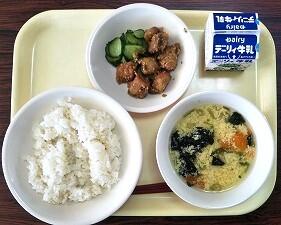 麦ごはん、かき玉汁、魚のごま油和え、きゅうり、牛乳