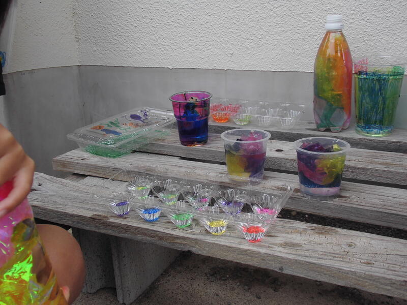 図工の時間、透明なシートや容器に美しい色をつけて、秋の光に透かしてみました。虹色にかがやく作品を白い壁で確認したら、児童は思わず歓声をあげていました。光の不思議な世界にうっとり見とれ、水を入れたり、重ねてみたり、友達の作品と合体させて別の形を作ったりして、様々な形や色を楽しんでいました。