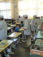 重いお盆や食缶を2人で協力して運ぶ姿や、6年生がよそってくれたおかずをこぼさないように