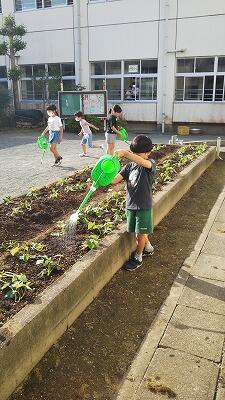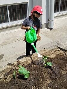 今日も、子どもたちは元気に登校していました。また、始業までの時間に、畑に水やりをする姿も見られました。