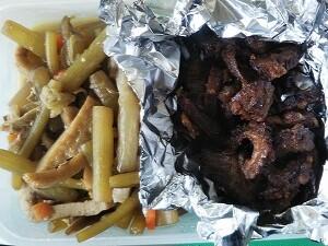 【できあがった「つわの煮付け」と「ごんぐりの唐揚げ」と「のたいも」】