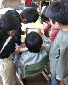 タブレットを使って、フルーツケーキに入れたいフルーツを書きました。1年生も立派に使いこなしていました。教え合う姿も見られました。