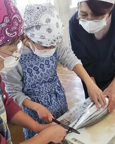 乾燥させた大根を、地域の方に教えてもらいながら切りました。「ねこの手」で、上手に切っていました。