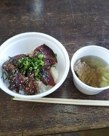 切ったかつおは、特製タレに漬けて、かつおのづけ丼が完成しました。あら汁も付きました。