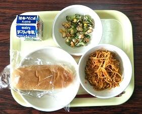 減量コッペパン、スパゲティミートソース、大豆とツナのサラダ、牛乳