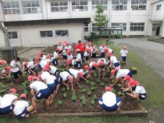 先日、「コメリ緑資金」を活用して、コメリ南郷店の職員の方々と6年生が、学年園に花の苗を植えました。学年でデザインした配置に従って、ヨクサクスミレとノースポールを植えていきました。卒業式まで大切にお世話をしていきます。