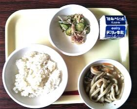 減量麦ごはん、肉ごぼううどん、きゅうりとささみの梅肉和え、牛乳
