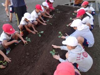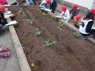 みんなで畝を作り、キャベツとブロッコリーの苗を植え、その隣にホウレンソウと小松菜の種をまきました。大きく育つように、またみんなで世話をしたり観察したりしていくことにしました。