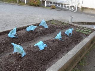 1月の下旬、5年生が学年の花だんにチューリップの球根を植えました。色は、赤、白、黄、むらさきなどです。今、7~8センチメートルぐらいの芽が出ています。大きく育ってきれいな花を咲かせてほしいです。そのために、水あげなどお世話をちゃんとしたいです。(5年2組 図書・広報委員会児童)