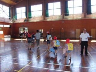 昨日、避難訓練(風水害)を実施しました。集団下校を行う想定で、まず体育館に集合しました。