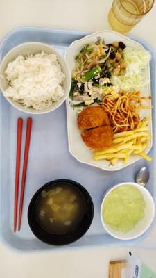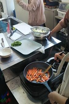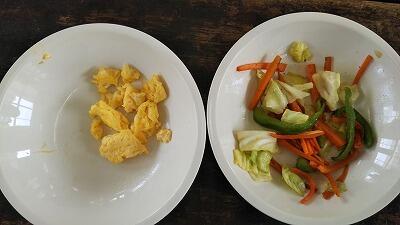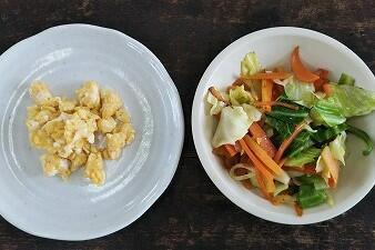 6年生が調理実習をしました。メニューは、スクランブルエッグと三色野菜炒めです。