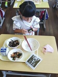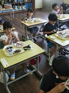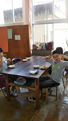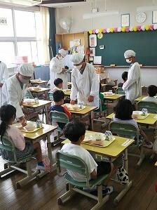 1年生の教室の前を通ると、6年生が配膳をしていました。