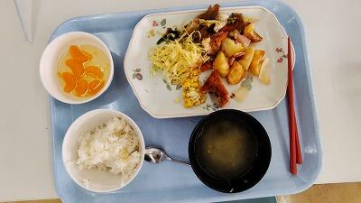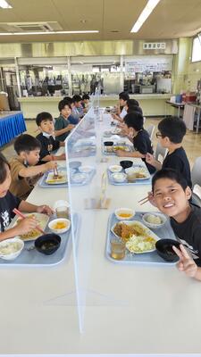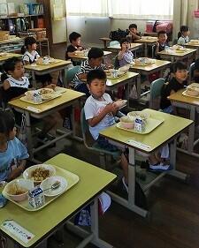 当番は受け取って給食室前で並んで、先頭の子が「○年○組、出発します。」と言うと、みんなで「はい。」と元気よく返事をして教室に向かいます。