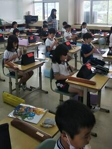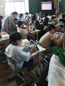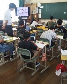 6年生が国語の授業で、タブレットを使って友達の考えを知り、自分の考えを深める学習をしていました。ノートに書いた各自の考えを写真に撮り、それを提出することで、みんなが友達の考えに触れられるようにしていました。
