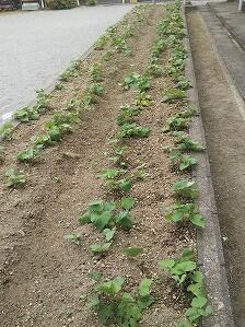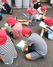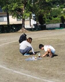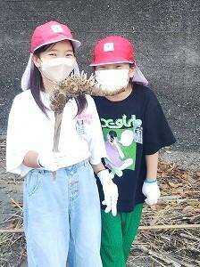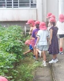 また、2年生がイモ畑の観察をしていました。雑草を抜いたり、生長を観察したり、虫を見つけたりしていました。「イモが見えてる!」と、土から出てきているサツマイモを見つけて大喜びでした。土の中にはたくさんのイモができていることでしょう。収穫が楽しみです。