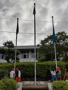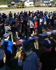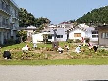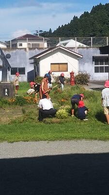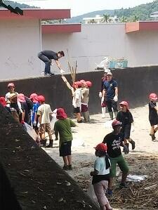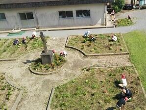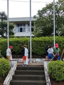 前回は雨天のために室内の清掃をしていただきましたが、今回は運動場を中心に草抜き、落ち葉掃き、側溝の泥上げ等をしていただきました。