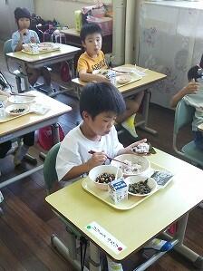 1年生は、とてもお行儀良く座って、配膳が終わるのを待っていました。