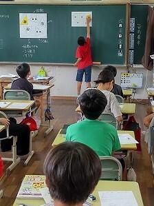 3年生が算数の授業で、3人組で解き方を確認する活動をしていました。対話をとおして深く学ぶ学習でした。