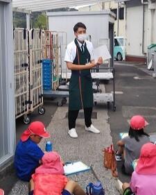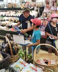 その後、店長さんに店のことをお話していただき、子どもたちは質問をしました。質問には、店長さんと野菜コーナーと魚コーナーの責任者の方が答えてくださいました。
