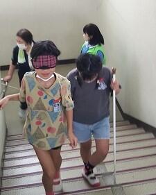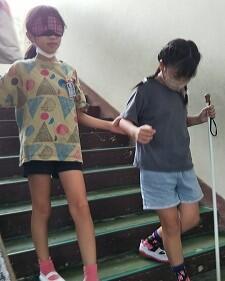 アイマスク体験では、白杖をもって廊下や階段を上がりました。視覚情報のないことの大変さを知りました。