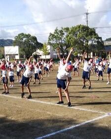 体育委員会は、運動会の準備運動のラジオ体操をしていました。