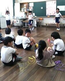 なわとびの発表をするようです。前跳び、後ろ跳び、あや跳び、交差跳び等、練習してできるようになった技を披露するようです。みんな、がんばって!